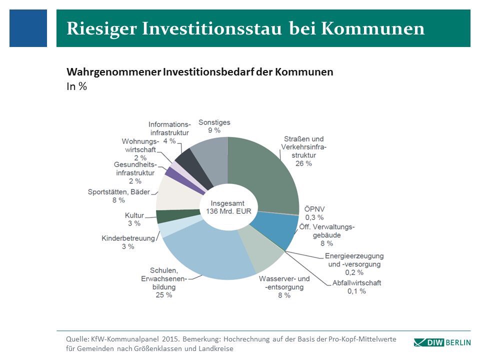 Darin fordert er vor allem deutlich mehr Investitionen des Staates in die öffentliche Infrastruktur. Vor allem in NRW, dem Saarland, in Bremen und in Berlin sei in den vergangenen Jahren aufgrund der hohen Schulden massiv gespart worden. Die Infrastruktur hingegen wurde auf Verschleiß gefahren. Das nennt die Kommission die Vernichtung von volkswirtschaftlichem Eigentum. Die Begründung: „Sind die Abschreibungen größer als die Neuinvestitionen beschleunigt sich der Wertverlust der öffentlichen Infrastruktur“, so Fratzscher.